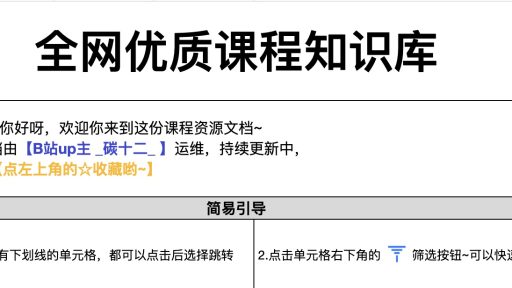 这个是一个B站UP主(_碳十二_)成立的一个在线文档,主要是集合网上免费优质的学习资源,我们学习各个领域的内容,可以不用焦虑是否要报班了,先看看这个文档里面有没有自己需要或感兴趣的内容吧!